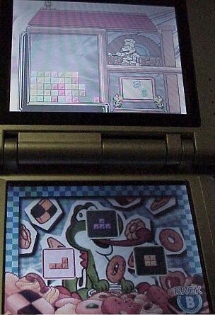In Puzzle mode, presented with a Yoshi's Cookie style screen and music, your goal is to clear a screen full of junk pieces on the top screen with only a certain selection of normal pieces on the bottom. There are two main catches when trying to solve this mode: You have to clear at least one line with each piece you drop, and, you can't choose where the piece is actually dropped. You select the piece on the bottom screen, rotate it to get it into the position you want, and then select it again to drop it. Where the piece is dropped is determined automatically by where it's "supposed" to drop. On one hand, again, this gives one less thing to worry about. On the other hand, it gives no indication of where the piece is going to drop until you select it, so, the first few moves of each puzzle are often just figuring out what the pieces are going to do. This mode does feel rather more awkward and stiff than it might have otherwise, but, after a bit of time, it does flow a bit more smoothly. Here, you have a total of 200 different puzzles to choose from. So, it will definitely occupy a good amount of time to solve them all.
