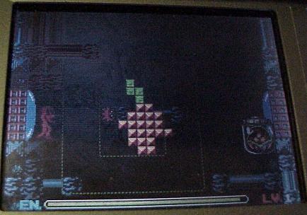 The last Single-Player mode is Catch. Here, in a stage set with a Metroid theme, on the bottom screen you start off with a single block in the middle of the screen. Your goal is to take the Tetris pieces that come floating down from the top, and assemble them around this core block to form bigger squares, within the dotted square patterns that are displayed. You can move the central core (which, as you build pieces around it, will get much bigger) back and forth around anywhere on the bottom screen. You can rotate the core on the bottom, but, can't change the way the pieces from the top are falling. As you're playing, the background screen will slowly be scrolling down, and with it enemies will also be coming along. When your core forms into bigger blocks, the new block will turn white and you'll have a chance to set off an explosion. The explosion will go off in all four directions from where your central block is, and destroy any enemies which are in its path. As you destroy enemies and get points, you'll move up in levels. If your block comes into contact with one of the enemies, you'll lose health from a health meter at the bottom.